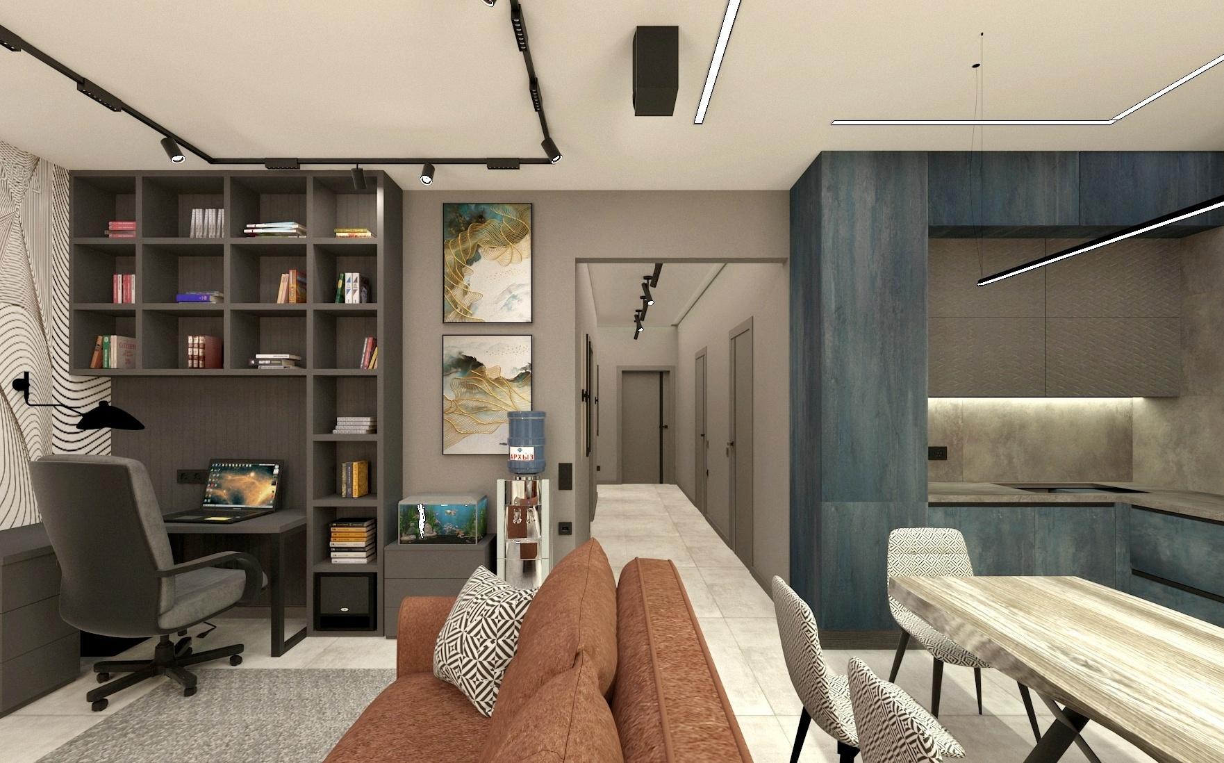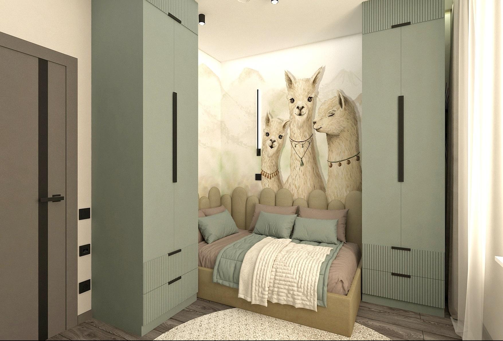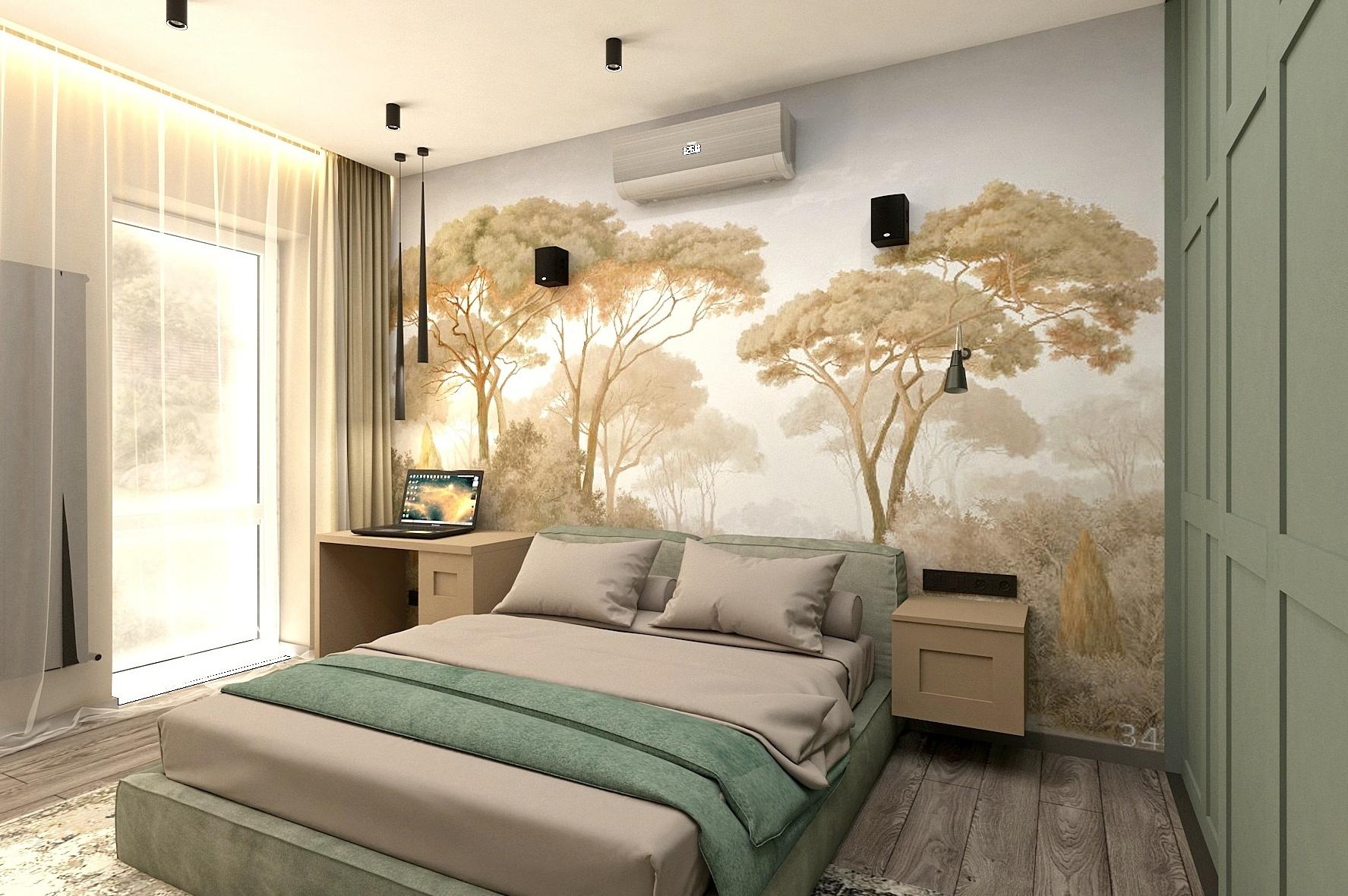 В прихожей расположен вместительный шкаф для верхней одежды, зеркало в полный рост, дизайн-радиатор и видео домофон. Кухня-гостиная вмещает в себя несколько зон: зона кухни, столовая группа, зона мягкой мебели, а также рабочее место главы семьи. В хозяйской спальне акцентную стену украшает фреска с изображением леса, спланирован туалетный столик- дополнительное рабочее место. В ванной размещена отдельностоящая ванная и душевая, что помогает удовлетворить предпочтения каждого члена семьи.