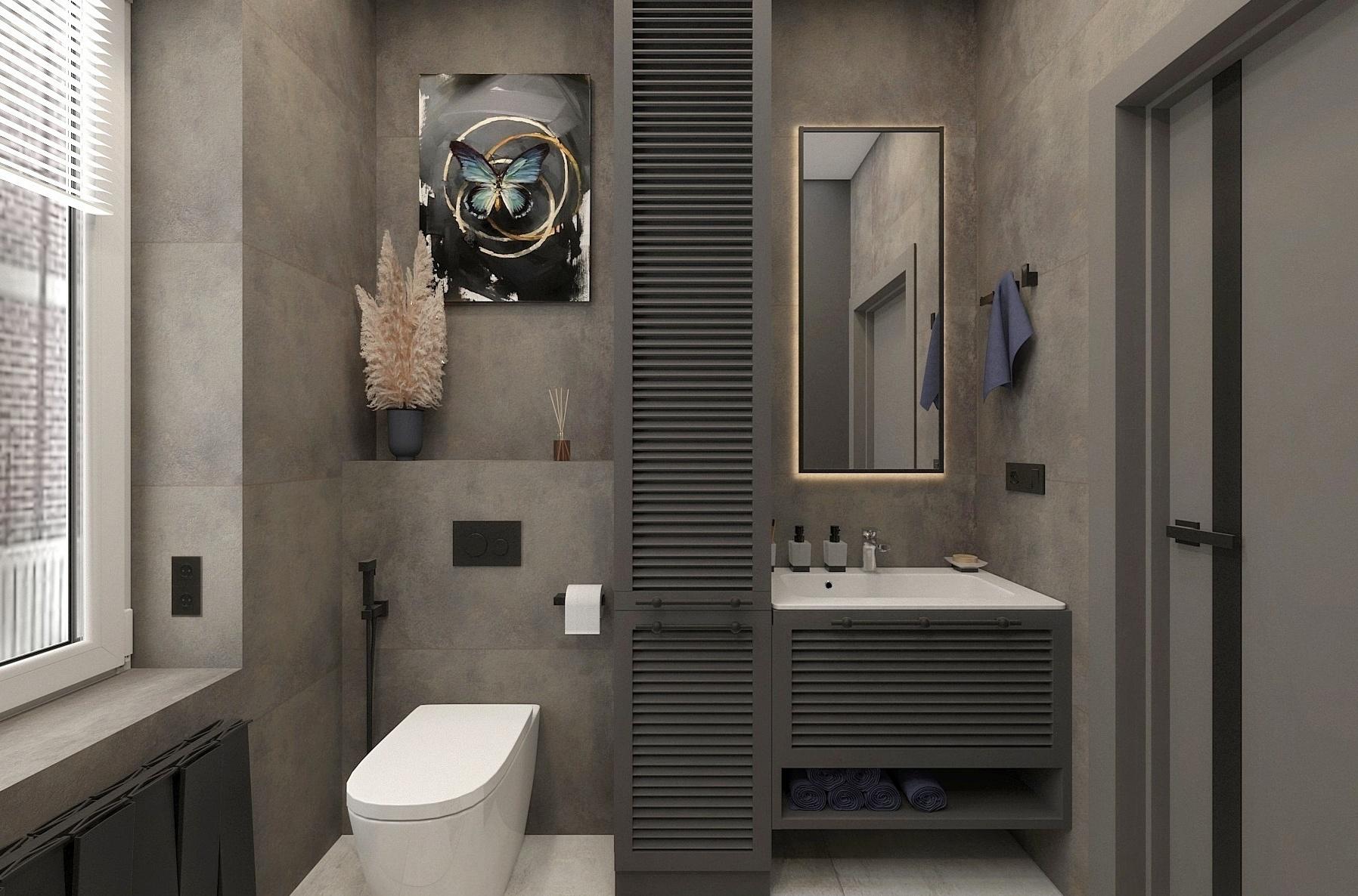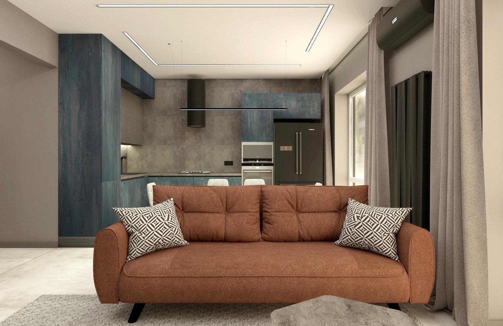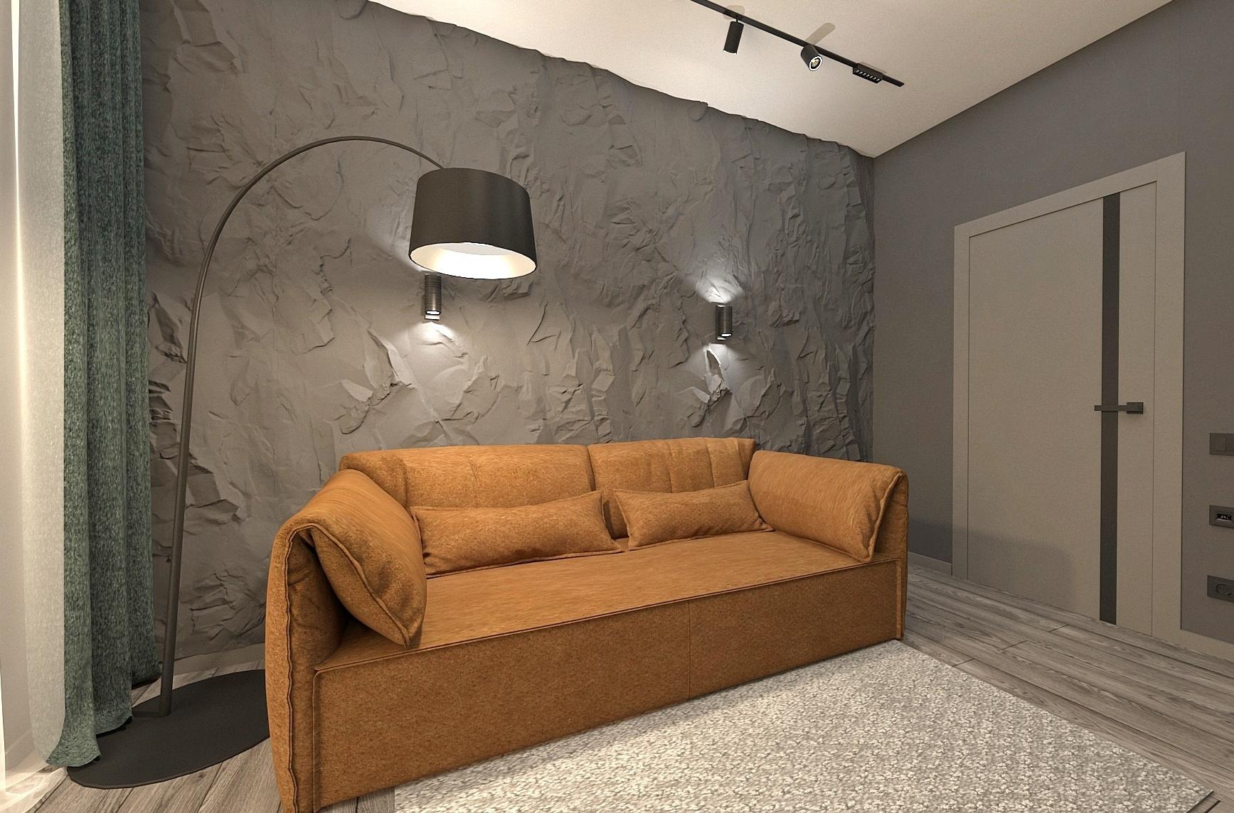 В прихожей расположен вместительный шкаф для верхней одежды, зеркало в полный рост, дизайн-радиатор и видео домофон. Кухня-гостиная вмещает в себя несколько зон: зона кухни, столовая группа, зона мягкой мебели, а также рабочее место главы семьи. В хозяйской спальне акцентную стену украшает фреска с изображением леса, спланирован туалетный столик- дополнительное рабочее место. В ванной размещена отдельностоящая ванная и душевая, что помогает удовлетворить предпочтения каждого члена семьи.